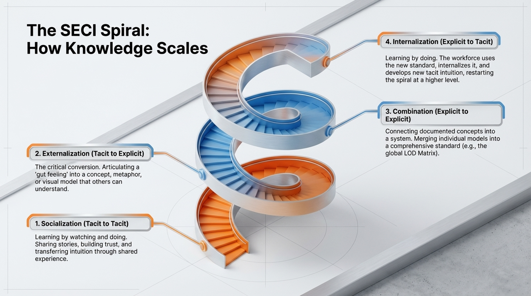 AI isn't going to walk the job site. It isn't going to build trust with a foreman. To lead, you must drive the four phases of the knowledge spiral yourself: